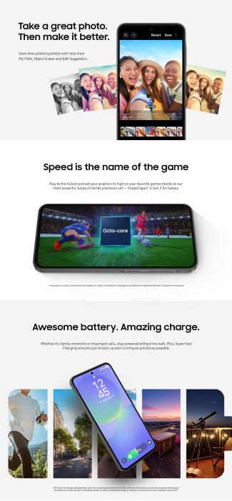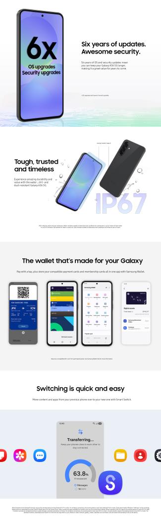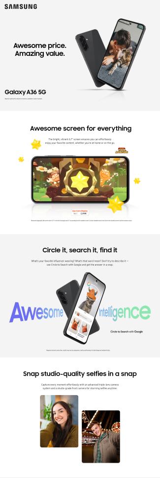 Unbeatable value with a slim, durable design and all the essential features you need await on Galaxy A36 5G. With more storage, you can keep your favorite photos, apps and memories without worrying about running out of space. Capture stunning studio-grade selfies with the enhanced front camera and easily polish them with AI photo editing tools. The large 6.7" display makes gaming, scrolling and movie nights more enjoyable than ever. Plus, the redesigned One UI 7 interface offers smoother navigation and personalized design, giving you effortless access to the features you love most. Whether you're staying connected, capturing moments or browsing, A36 5G gives you premium performance at an affordable price. It's the smart choice you’ve been waiting for. Awesome price. Amazing value.